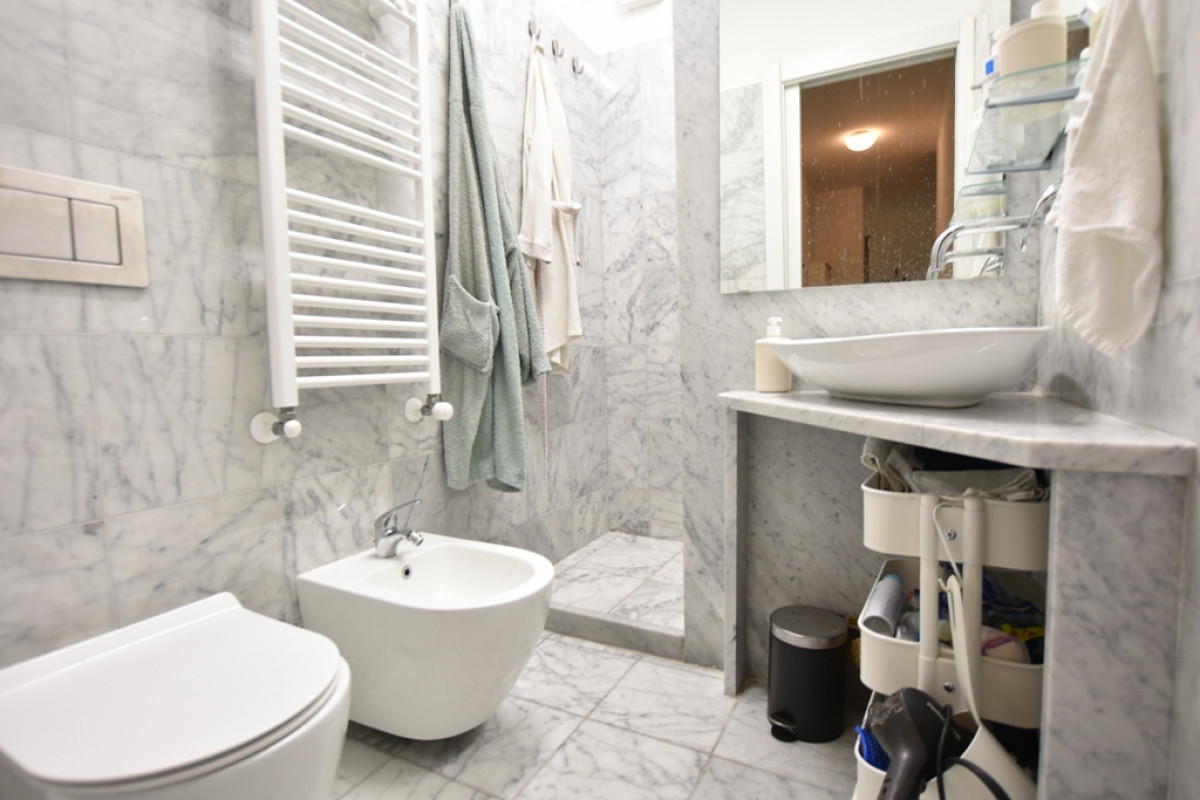 Attraverso il disimpegno, che separa la zona notte, si raggiungono due comode camere, un utilissimo ripostiglio con zona lavanderia e il bagno con aspiratore.
