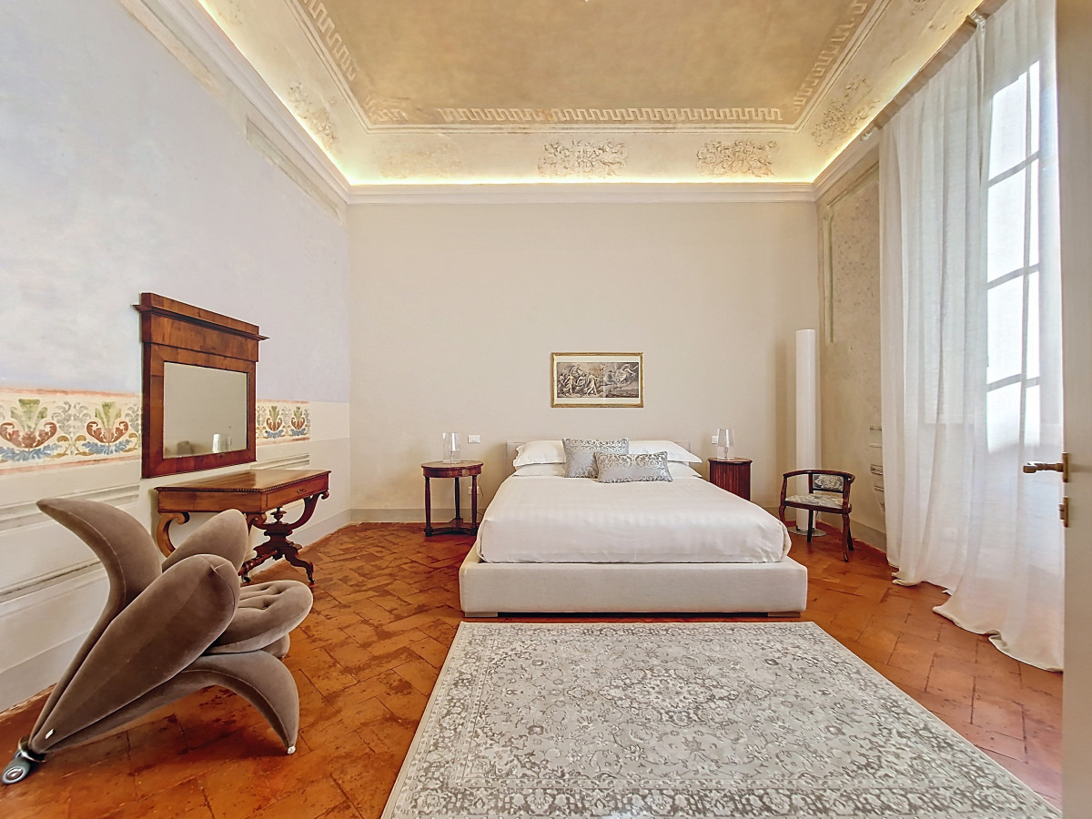 La proprietà si sviluppa su quattro livelli collegati da una scenografica scala in pietra, arricchita da ferro battuto e legno lavorato, illuminata dall’alto da una grande apertura che diffonde luce naturale. Grazie alla doppia esposizione, gli ambienti risultano luminosi e ariosi. Attualmente sono presenti sei suite di ampia metratura, restaurate con attenzione e gusto, dove materiali originali e dettagli storici si combinano con soluzioni più contemporanee.