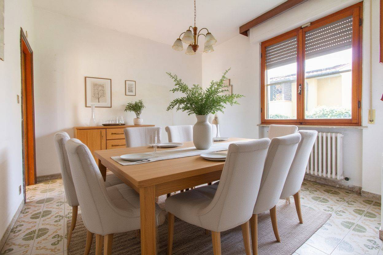In contesto residenziale tranquillo, proponiamo porzione di villa duplex al piano terra, caratterizzata da ampi spazi e giardino su tre lati.